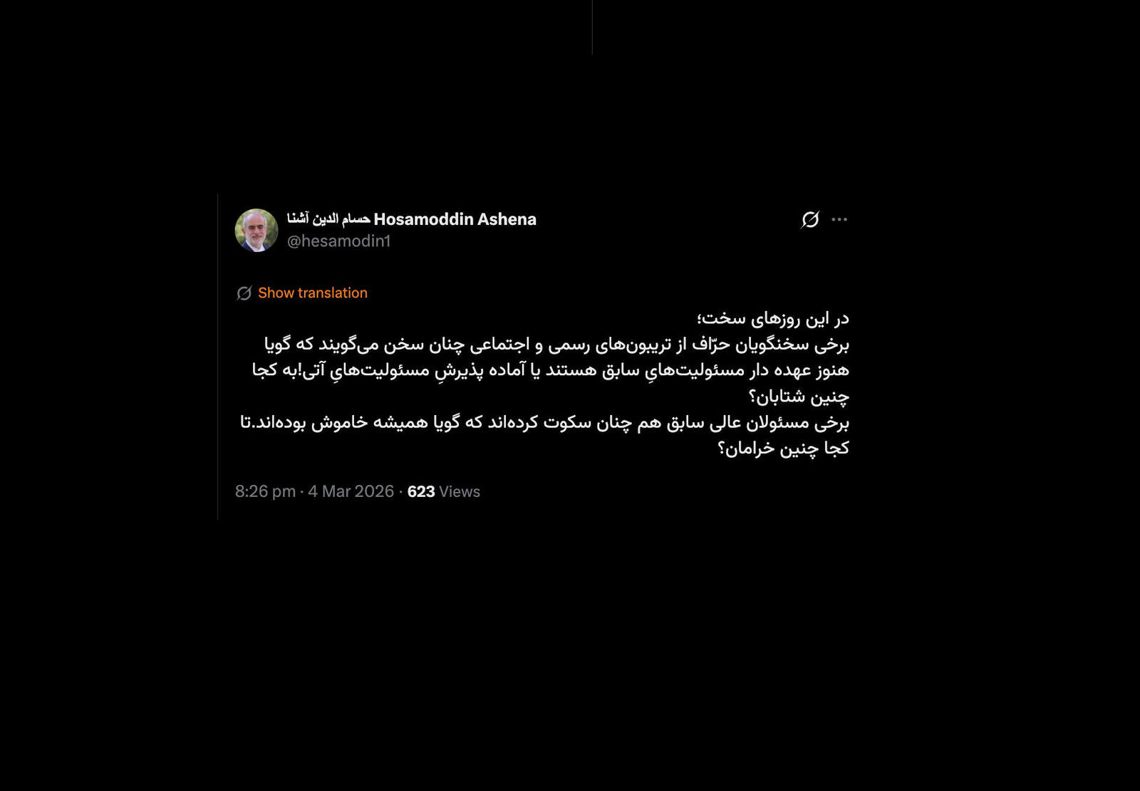 خانه/سیاستآقای آشنا درود موضوعات بالاتر از این مسائلی است که اجمالاً نوشتهاید آنچه خیلی مهم است عدم اطلاع رسانی برای گزینه انتخاب شده خبرگان استخواندن1 دقیقه -سه شنبه 1405/01/18 - 15:19کد خبر24588اشتراکگذاری دقیقا چه مواردی است که در حین جنگ و نیاز به رهبر و فرمانده کل قوا رهبر منتخب را اطلاع رسانی نمی کنند؟در این روزهای سخت؛برخی سخنگویان حرّاف از تریبونهای رسمی و اجتماعی چنان سخن میگویند که گویا هنوز عهده دار مسئولیتهایِ سابق هستند یا آماده پذیرشِ مسئولیتهایِ آتی!به کجا چنین شتابان؟برخی مسئولان عالی سابق هم چنان سکوت کردهاند که گویا همیشه خاموش بودهاند.تا کجا چنین خرامان؟— حسام الدین آشنا Hosamoddin Ashena (@hesamodin1) March 4, 2026🔴 جناب آشنا، درود💢موضوعات بالاتر از این مسائلی است که اجمالاً نوشتهاید📌آنچه خیلی مهم است عدم اطلاع رسانی برای گزینه #انتخاب_شده خبرگان است📌دقیقا چه مواردی است که در حین جنگ و نیاز به رهبر و فرمانده کل قوا رهبر منتخب را اطلاع رسانی نمی کنند؟— AbdiMedia - Abdollah Abdi (@abdolah_abdi) March 4, 2026 کمتر از یک دقیقه زمان بگذارید، ثبتنام کنید و نظرتان را زیر همین پست به اشتراک بگذارید.پیامهای توهینآمیز و یا حاوی دعوت به خشونت حذف خواهند شد.ثبت نامدر ادامه بخوانید سید مجتبی خامنهای رهبر منتقم هست و نه مصلحخواندن 1 دقیقه اندکی پیش از اعلام نام رهبر سوم جمهوری اسلامی در گفتگویی تحلیلی به سناریوهای آینده با ساختار فعلی جمهوری اسلامی پرداختمخواندن 0 بالاخره اکثریت این دوره مجلس خبرگان رهبری با مشورت و رایزنی بیشتر، صلاح را در این دانست که برای گزینه رهبر سوم به سراغ آیتالله سید مجتبی خامنهای برود و نام او را نهایی و اعلام کند.خواندن 1 دقیقه سیدمجتبی خامنهای با رأی مجلس خبرگان سومین رهبر انقلاب اسلامی ایران شدخواندن 2 دقیقه آقای علی حسین قاضی زاده از تبلیغ عبدی مدیا متشکرم حتی اگر دریچه اطلاع رسانی یک ایرانی که موج سواری نمی کند و از خون جوانان وطن و شهروندان ایران بزرگ و متحد برای خود کلاه و منفعتی عاید نمی کند.خواندن 1 دقیقهباید خواندخاطرات اکبر هاشمی - ۱ اسفند ۱۳۷۸ - ملاقات عبدالله جاسبی و نگرانی از نتایج انتخاباتفیلم/ سردار مرتضی طلایی کجاست؟خاطرات اکبر هاشمی - ۱۹ شهريور ۱۳۷۸ - مذاکرات دو نفره سیاسی با واعظ طبسی تا هنگام بدرقه به سوی تهران هم ادامه داشته که در نهایت هاشمی ظاهرا از اینجا تصمیم به شرکت جدی در انتخابات مجلس ششم گرفتسوابق ادوار اخیر مجلس شورای اسلامی نشان داد که مجلس در راس امور نیست و در اختیارات فرمانده کل قوا و نیروهای مسلح در هیچ سطحی نمیتواند دخالت و یا مصوبه طی کند، چه برسد که نظارت کندآینده ایران با نامزدهای اعلام شده انتخابات ریاست جمهوری چه میشود؟ / گفتگو با دکتر تقی آزاد ارمکیمیشه با شما احساس خستگی کرد؟یک دامپزشک بسیجی بجای جراح گوش و حلق و بینی سرپرست شبکه بهداشت ایذه شد!خاطرات اکبر هاشمی - ۱۴ شهريور ۱۳۷۸ - دیدار مدیران ارشد دستگاه قضایی با هاشمی رفسنجانی و گله آنان از بی توجهی هاشمی شاهرودی رییس جدید قوه قضاییه ادامه داردخاطرات اکبر هاشمی - ۱۶ شهريور ۱۳۷۸ - در ادامه تلاش های مرحوم واعظ طبسی که در دیدارهای مکرر برای تشویق هاشمی به شرکت در انتخابات اقدام میکرد این بار هم او با هاشمی ملاقات کردخاطرات اکبر هاشمی - ۱۸ شهريور ۱۳۷۸ - ادامه بازدید ها از متعلقات و ابنیه و آثار آستان قدس