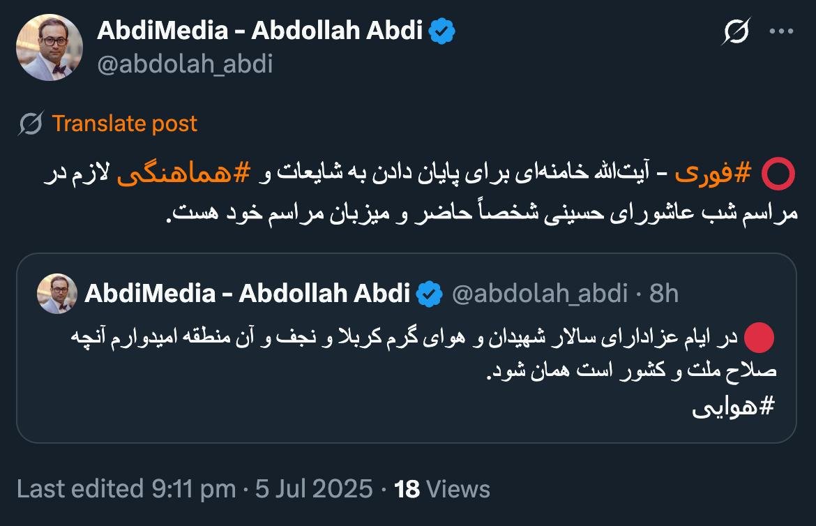 خانه/سیاست آیتالله خامنهای برای پایان دادن به شایعات و هماهنگی لازم در مراسم شب عاشورای حسینی شخصاً حاضر و میزبان مراسم خود هست.خواندن1 دقیقه -یکشنبه 1404/04/15 - 10:42کد خبر20941اشتراکگذاری اخبار مرتبط در ایام عزادارای سالار شهیدان و هوای گرم کربلا و نجف و آن منطقه امیدوارم آنچه صلاح ملت و کشور است همان شود. کمتر از یک دقیقه زمان بگذارید، ثبتنام کنید و نظرتان را زیر همین پست به اشتراک بگذارید.پیامهای توهینآمیز و یا حاوی دعوت به خشونت حذف خواهند شد.ثبت نامدر ادامه بخوانید جناب آشنا درود شما هم در حال بررسی این نظریه هستید که ممکن است اساساً این لشکرکشی آمریکا نهایتاً هدفی غیر از جمهوری اسلامی باشد؟خواندن 1 دقیقه موضوع کاملا روشن است با اشاره به قوه قضاییه آزاد شدند و این اشاره چنان پیگیری سریعی داشت که برای متهمین حتی روز تعطیل قرار قبولی وثیقه صادر و آزاد شدند.خواندن 1 دقیقه آقای دکتر درود نتیجه اعلام نظر پزشکی قانونی که خانواده ایشان از دادسرا دنبال کردند چه شد؟خواندن 1 دقیقه پاسخ های توییتری 30 بهمنخواندن 4 دقیقه در داخل کشور واقعا چه خبر است؟خواندن 1 دقیقهباید خواندخاطرات اکبر هاشمی - ۱ اسفند ۱۳۷۸ - ملاقات عبدالله جاسبی و نگرانی از نتایج انتخاباتفیلم/ سردار مرتضی طلایی کجاست؟خاطرات اکبر هاشمی - ۱۹ شهريور ۱۳۷۸ - مذاکرات دو نفره سیاسی با واعظ طبسی تا هنگام بدرقه به سوی تهران هم ادامه داشته که در نهایت هاشمی ظاهرا از اینجا تصمیم به شرکت جدی در انتخابات مجلس ششم گرفتسوابق ادوار اخیر مجلس شورای اسلامی نشان داد که مجلس در راس امور نیست و در اختیارات فرمانده کل قوا و نیروهای مسلح در هیچ سطحی نمیتواند دخالت و یا مصوبه طی کند، چه برسد که نظارت کندآینده ایران با نامزدهای اعلام شده انتخابات ریاست جمهوری چه میشود؟ / گفتگو با دکتر تقی آزاد ارمکیمیشه با شما احساس خستگی کرد؟یک دامپزشک بسیجی بجای جراح گوش و حلق و بینی سرپرست شبکه بهداشت ایذه شد!خاطرات اکبر هاشمی - ۱۴ شهريور ۱۳۷۸ - دیدار مدیران ارشد دستگاه قضایی با هاشمی رفسنجانی و گله آنان از بی توجهی هاشمی شاهرودی رییس جدید قوه قضاییه ادامه داردخاطرات اکبر هاشمی - ۱۶ شهريور ۱۳۷۸ - در ادامه تلاش های مرحوم واعظ طبسی که در دیدارهای مکرر برای تشویق هاشمی به شرکت در انتخابات اقدام میکرد این بار هم او با هاشمی ملاقات کردخاطرات اکبر هاشمی - ۱۸ شهريور ۱۳۷۸ - ادامه بازدید ها از متعلقات و ابنیه و آثار آستان قدس