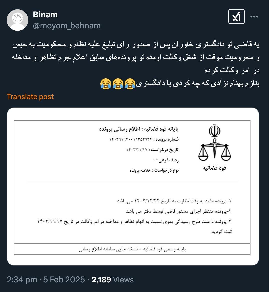 خانه/سیاست آقای سخنگوی قوه قضاییه درود واقعا بهنام نزادی وکیل دادگستری چه کرده او را گرفتار داستان ها و پرونده های عجبب و غریب کردهاند؟خواندن1 دقیقه -پنجشنبه 1403/11/18 - 16:34کد خبر13040اشتراکگذاری خوب است بفرمایید بازرسی ویژه قوه قضاییه و معاونت ارزشیابی قضات دادستان انتظامی قضات پرونده های اتهامی و محاکماتی و اجرایی وی را بررسی کنند واقعا بهنام نزادی وکیل دادگستری چه کرده او را گرفتار داستان ها و پرونده های عجبب و غریب کردهاند؟ خوب است بفرمایید بازرسی ویژه قوه قضاییه و معاونت ارزشیابی قضات دادستان انتظامی قضات پرونده های اتهامی و محاکماتی و اجرایی وی را بررسی کنندآموزش تخلفات انتظامی قضات حتی اگر با زبان کمی صریح باشد مستحق این برخوردها نیست؛ هست؟یه قاضی تو دادگستری خاوران پس از صدور رای تبلیغ علیه نظام و محکومیت به حبس و محرومیت موقت از شغل وکالت اومده تو پروندههای سابق اعلام جرم تظاهر و مداخله در امر وکالت کردهبنازم بهنام نزادی که چه کردی با دادگستری😂😂😂 pic.twitter.com/wgY0epp1hC— Binam (@moyom_behnam) February 5, 2025🔴 آقای سخنگوی قوه قضاییهدرود@MizanNewsAgency 💢 واقعا بهنام نزادی وکیل دادگستری چه کرده او را گرفتار داستان ها و پرونده های عجبب و غریب کردهاند؟📌 خوب است بفرمایید بازرسی ویژه قوه قضاییه و معاونت ارزشیابی قضات دادستان انتظامی قضات پرونده های اتهامی و محاکماتی و اجرایی وی… https://t.co/TftcOdDh5v— AbdiMedia - Abdollah Abdi (@abdolah_abdi) February 6, 2025 کمتر از یک دقیقه زمان بگذارید، ثبتنام کنید و نظرتان را زیر همین پست به اشتراک بگذارید.پیامهای توهینآمیز و یا حاوی دعوت به خشونت حذف خواهند شد.ثبت نامدر ادامه بخوانید سید مجتبی خامنهای رهبر منتقم هست و نه مصلحخواندن 1 دقیقه اندکی پیش از اعلام نام رهبر سوم جمهوری اسلامی در گفتگویی تحلیلی به سناریوهای آینده با ساختار فعلی جمهوری اسلامی پرداختمخواندن 0 بالاخره اکثریت این دوره مجلس خبرگان رهبری با مشورت و رایزنی بیشتر، صلاح را در این دانست که برای گزینه رهبر سوم به سراغ آیتالله سید مجتبی خامنهای برود و نام او را نهایی و اعلام کند.خواندن 1 دقیقه سیدمجتبی خامنهای با رأی مجلس خبرگان سومین رهبر انقلاب اسلامی ایران شدخواندن 2 دقیقه آقای علی حسین قاضی زاده از تبلیغ عبدی مدیا متشکرم حتی اگر دریچه اطلاع رسانی یک ایرانی که موج سواری نمی کند و از خون جوانان وطن و شهروندان ایران بزرگ و متحد برای خود کلاه و منفعتی عاید نمی کند.خواندن 1 دقیقهباید خواندخاطرات اکبر هاشمی - ۱ اسفند ۱۳۷۸ - ملاقات عبدالله جاسبی و نگرانی از نتایج انتخاباتفیلم/ سردار مرتضی طلایی کجاست؟خاطرات اکبر هاشمی - ۱۹ شهريور ۱۳۷۸ - مذاکرات دو نفره سیاسی با واعظ طبسی تا هنگام بدرقه به سوی تهران هم ادامه داشته که در نهایت هاشمی ظاهرا از اینجا تصمیم به شرکت جدی در انتخابات مجلس ششم گرفتسوابق ادوار اخیر مجلس شورای اسلامی نشان داد که مجلس در راس امور نیست و در اختیارات فرمانده کل قوا و نیروهای مسلح در هیچ سطحی نمیتواند دخالت و یا مصوبه طی کند، چه برسد که نظارت کندآینده ایران با نامزدهای اعلام شده انتخابات ریاست جمهوری چه میشود؟ / گفتگو با دکتر تقی آزاد ارمکیمیشه با شما احساس خستگی کرد؟یک دامپزشک بسیجی بجای جراح گوش و حلق و بینی سرپرست شبکه بهداشت ایذه شد!خاطرات اکبر هاشمی - ۱۴ شهريور ۱۳۷۸ - دیدار مدیران ارشد دستگاه قضایی با هاشمی رفسنجانی و گله آنان از بی توجهی هاشمی شاهرودی رییس جدید قوه قضاییه ادامه داردخاطرات اکبر هاشمی - ۱۶ شهريور ۱۳۷۸ - در ادامه تلاش های مرحوم واعظ طبسی که در دیدارهای مکرر برای تشویق هاشمی به شرکت در انتخابات اقدام میکرد این بار هم او با هاشمی ملاقات کردخاطرات اکبر هاشمی - ۱۸ شهريور ۱۳۷۸ - ادامه بازدید ها از متعلقات و ابنیه و آثار آستان قدس