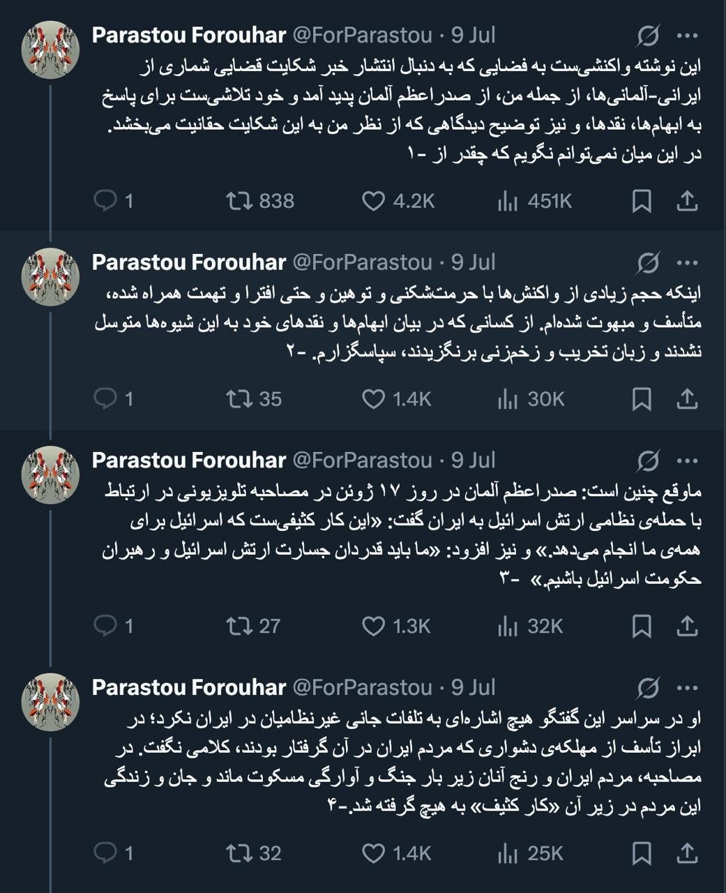 خانه/سیاستتوییت مشروح توضیحات پرستو فروهرخواندن1 دقیقه -جمعه 1404/04/20 - 12:45کد خبر21160اشتراکگذاری تصویر تصویر تصویر تصویر کمتر از یک دقیقه زمان بگذارید، ثبتنام کنید و نظرتان را زیر همین پست به اشتراک بگذارید.پیامهای توهینآمیز و یا حاوی دعوت به خشونت حذف خواهند شد.ثبت نامدر ادامه بخوانید پاسخ های توییتری 2 اسفندخواندن 1 دقیقه جناب آشنا درود شما هم در حال بررسی این نظریه هستید که ممکن است اساساً این لشکرکشی آمریکا نهایتاً هدفی غیر از جمهوری اسلامی باشد؟خواندن 1 دقیقه موضوع کاملا روشن است با اشاره به قوه قضاییه آزاد شدند و این اشاره چنان پیگیری سریعی داشت که برای متهمین حتی روز تعطیل قرار قبولی وثیقه صادر و آزاد شدند.خواندن 1 دقیقه آقای دکتر درود نتیجه اعلام نظر پزشکی قانونی که خانواده ایشان از دادسرا دنبال کردند چه شد؟خواندن 1 دقیقه پاسخ های توییتری 30 بهمنخواندن 4 دقیقهباید خواندخاطرات اکبر هاشمی - ۱ اسفند ۱۳۷۸ - ملاقات عبدالله جاسبی و نگرانی از نتایج انتخاباتفیلم/ سردار مرتضی طلایی کجاست؟خاطرات اکبر هاشمی - ۱۹ شهريور ۱۳۷۸ - مذاکرات دو نفره سیاسی با واعظ طبسی تا هنگام بدرقه به سوی تهران هم ادامه داشته که در نهایت هاشمی ظاهرا از اینجا تصمیم به شرکت جدی در انتخابات مجلس ششم گرفتسوابق ادوار اخیر مجلس شورای اسلامی نشان داد که مجلس در راس امور نیست و در اختیارات فرمانده کل قوا و نیروهای مسلح در هیچ سطحی نمیتواند دخالت و یا مصوبه طی کند، چه برسد که نظارت کندآینده ایران با نامزدهای اعلام شده انتخابات ریاست جمهوری چه میشود؟ / گفتگو با دکتر تقی آزاد ارمکیمیشه با شما احساس خستگی کرد؟یک دامپزشک بسیجی بجای جراح گوش و حلق و بینی سرپرست شبکه بهداشت ایذه شد!خاطرات اکبر هاشمی - ۱۴ شهريور ۱۳۷۸ - دیدار مدیران ارشد دستگاه قضایی با هاشمی رفسنجانی و گله آنان از بی توجهی هاشمی شاهرودی رییس جدید قوه قضاییه ادامه داردخاطرات اکبر هاشمی - ۱۶ شهريور ۱۳۷۸ - در ادامه تلاش های مرحوم واعظ طبسی که در دیدارهای مکرر برای تشویق هاشمی به شرکت در انتخابات اقدام میکرد این بار هم او با هاشمی ملاقات کردخاطرات اکبر هاشمی - ۱۸ شهريور ۱۳۷۸ - ادامه بازدید ها از متعلقات و ابنیه و آثار آستان قدس