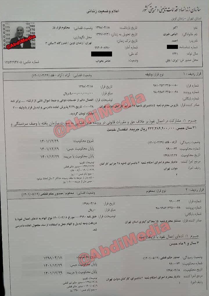 خانه/سیاستجناب آقای مدیرعامل محترم و راستگو و دقیق خبرگزاری میزانخواندن2 دقیقه -دوشنبه 1403/06/26 - 12:25کد خبر2128اشتراکگذاریتصویر تصویر تصویر PreviousNextاین اعلام وضعیت کامل صفحات سیستم متمرکز زندانیان سازمان زندانها و اقدامات تامینی و تربیتی کشور است که البته من نگفته ام کاردکس یا همان کارت عکس زندانی وجنابعالی و هر شخص دیگری هم اصالت آن را میتواند به سهولت راستی آزمایی کند.اکبر طبری تاکنون (رسماً ) ۳۴ روز در مرخصی بوده و الان البته حاضر به خواب در بازداشتگاه اوین است.حالا شما بفرمایید کجای این سوابق زندان وی دروغ است؟ و بعد شما چرا قلب واقعیت می کنی؟موضوعی کاملا حقوقی وساده که پس از پذیرش اعاده دادرسی را که متهم با تودیع وثیقه تا رسیدگی نهایی وقطعیت آن آزاد است و چنانچه (به علت دیگری در بازداشت نباشد) از زندان آزاد میشود را کتمان می کنید؟قوه قضاییه نگران چیست؟میدانید و مخاطبان فرهیخته عبدی مدیا میدانند که تا کنون بلوف نزدم و هیچ خبر کذبی را منتشر نکردهام و البته جو زده هم نشده ام و انتشار اخبار صحیح هدف من بوده است، آیا نیاز و مصلحت است بقیه اسناد شامل تودیع وثایق واینکه چه افراد خاصی نیز آنها را تهیه کردند و دادنامه شعبه دیوان و اسناد تصمیمات قضایی شعبه ۱۵ کیفری ۱ تهران ولوایح وکیل و مکاتبات قضایی هم عیناً منتشر شود یا خیر؟آقای مدیر عاملجالب است اکبر طبری بقدری برایتان مهم است که دستپاچه تکذیب می کنید اما بقیه نقدها و یادداشتهای من بخصوص در مورد استانداردهای دوگانه عدلیه را ملاحظه فرمودید اما دَم بر نیاوردید. کمتر از یک دقیقه زمان بگذارید، ثبتنام کنید و نظرتان را زیر همین پست به اشتراک بگذارید.پیامهای توهینآمیز و یا حاوی دعوت به خشونت حذف خواهند شد.ثبت نامدر ادامه بخوانید سید مجتبی خامنهای رهبر منتقم هست و نه مصلحخواندن 1 دقیقه اندکی پیش از اعلام نام رهبر سوم جمهوری اسلامی در گفتگویی تحلیلی به سناریوهای آینده با ساختار فعلی جمهوری اسلامی پرداختمخواندن 0 بالاخره اکثریت این دوره مجلس خبرگان رهبری با مشورت و رایزنی بیشتر، صلاح را در این دانست که برای گزینه رهبر سوم به سراغ آیتالله سید مجتبی خامنهای برود و نام او را نهایی و اعلام کند.خواندن 1 دقیقه سیدمجتبی خامنهای با رأی مجلس خبرگان سومین رهبر انقلاب اسلامی ایران شدخواندن 2 دقیقه آقای علی حسین قاضی زاده از تبلیغ عبدی مدیا متشکرم حتی اگر دریچه اطلاع رسانی یک ایرانی که موج سواری نمی کند و از خون جوانان وطن و شهروندان ایران بزرگ و متحد برای خود کلاه و منفعتی عاید نمی کند.خواندن 1 دقیقهباید خواندخاطرات اکبر هاشمی - ۱ اسفند ۱۳۷۸ - ملاقات عبدالله جاسبی و نگرانی از نتایج انتخاباتفیلم/ سردار مرتضی طلایی کجاست؟خاطرات اکبر هاشمی - ۱۹ شهريور ۱۳۷۸ - مذاکرات دو نفره سیاسی با واعظ طبسی تا هنگام بدرقه به سوی تهران هم ادامه داشته که در نهایت هاشمی ظاهرا از اینجا تصمیم به شرکت جدی در انتخابات مجلس ششم گرفتسوابق ادوار اخیر مجلس شورای اسلامی نشان داد که مجلس در راس امور نیست و در اختیارات فرمانده کل قوا و نیروهای مسلح در هیچ سطحی نمیتواند دخالت و یا مصوبه طی کند، چه برسد که نظارت کندآینده ایران با نامزدهای اعلام شده انتخابات ریاست جمهوری چه میشود؟ / گفتگو با دکتر تقی آزاد ارمکیمیشه با شما احساس خستگی کرد؟یک دامپزشک بسیجی بجای جراح گوش و حلق و بینی سرپرست شبکه بهداشت ایذه شد!خاطرات اکبر هاشمی - ۱۴ شهريور ۱۳۷۸ - دیدار مدیران ارشد دستگاه قضایی با هاشمی رفسنجانی و گله آنان از بی توجهی هاشمی شاهرودی رییس جدید قوه قضاییه ادامه داردخاطرات اکبر هاشمی - ۱۶ شهريور ۱۳۷۸ - در ادامه تلاش های مرحوم واعظ طبسی که در دیدارهای مکرر برای تشویق هاشمی به شرکت در انتخابات اقدام میکرد این بار هم او با هاشمی ملاقات کردخاطرات اکبر هاشمی - ۱۸ شهريور ۱۳۷۸ - ادامه بازدید ها از متعلقات و ابنیه و آثار آستان قدس