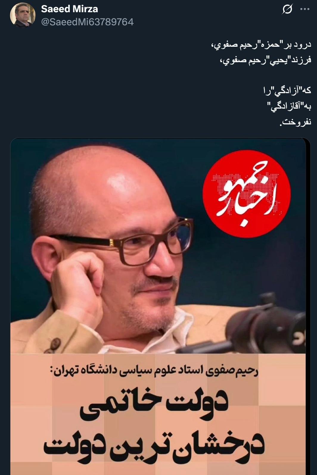 خانه/سیاست سردار دکتر سید یحیی صفوی مدتهاست کمتر اظهار نظر علنی کرده است، گرچه با قدرت و حمایت همچنان مشاور و دستیار فرمانده کل قوا هست.خواندن1 دقیقه -جمعه 1404/07/04 - 12:48کد خبر22814اشتراکگذاری سرکار خانم دکتر مهرشاد شبابی هم مدتهاست هیچ اظهارنظری از وی در فضای مجازی شنیده نمیشود سرکار خانم دکتر مهرشاد شبابی هم مدتهاست هیچ اظهارنظری از وی در فضای مجازی شنیده نمیشود و گویا با آن سوابق زیاد در عرصه های پیش و پس از انقلاب، چندان فعالیتی ندارد.ناگهان دکتر حمزه صفوی، برجسته شده و بی محابا، اظهارنظرهای جالب و قابل تامل میکند.دکتر حمزه اگر فرزند یحیی صفوی و مهرشاد شبابی نبود اینگونه آزادی عمل داشت؟زمان مشخص خواهد کرد درود بر"حمزه"رحيم صفوي،فرزند"يحيي"رحيم صفوي،كه"آزادگي"رابه"آقازادگي"نفروخت. pic.twitter.com/4BLzVY868L— Saeed Mirza (@SaeedMi63789764) September 25, 2025🔴 درود@rahim_safavi_ir 💢 سردار دکتر سید یحیی صفوی مدتهاست کمتر اظهار نظر علنی کرده است، گرچه با قدرت و حمایت همچنان مشاور و دستیار فرمانده کل قوا هست.📌سرکار خانم دکتر مهرشاد شبابی هم مدتهاست هیچ اظهارنظری از وی در فضای مجازی شنیده نمیشود و گویا با آن سوابق زیاد در عرصه های…— AbdiMedia - Abdollah Abdi (@abdolah_abdi) September 26, 2025 کمتر از یک دقیقه زمان بگذارید، ثبتنام کنید و نظرتان را زیر همین پست به اشتراک بگذارید.پیامهای توهینآمیز و یا حاوی دعوت به خشونت حذف خواهند شد.ثبت نامدر ادامه بخوانید پاسخ های توییتری 2 اسفندخواندن 1 دقیقه جناب آشنا درود شما هم در حال بررسی این نظریه هستید که ممکن است اساساً این لشکرکشی آمریکا نهایتاً هدفی غیر از جمهوری اسلامی باشد؟خواندن 1 دقیقه موضوع کاملا روشن است با اشاره به قوه قضاییه آزاد شدند و این اشاره چنان پیگیری سریعی داشت که برای متهمین حتی روز تعطیل قرار قبولی وثیقه صادر و آزاد شدند.خواندن 1 دقیقه آقای دکتر درود نتیجه اعلام نظر پزشکی قانونی که خانواده ایشان از دادسرا دنبال کردند چه شد؟خواندن 1 دقیقه پاسخ های توییتری 30 بهمنخواندن 4 دقیقهباید خواندخاطرات اکبر هاشمی - ۱ اسفند ۱۳۷۸ - ملاقات عبدالله جاسبی و نگرانی از نتایج انتخاباتفیلم/ سردار مرتضی طلایی کجاست؟خاطرات اکبر هاشمی - ۱۹ شهريور ۱۳۷۸ - مذاکرات دو نفره سیاسی با واعظ طبسی تا هنگام بدرقه به سوی تهران هم ادامه داشته که در نهایت هاشمی ظاهرا از اینجا تصمیم به شرکت جدی در انتخابات مجلس ششم گرفتسوابق ادوار اخیر مجلس شورای اسلامی نشان داد که مجلس در راس امور نیست و در اختیارات فرمانده کل قوا و نیروهای مسلح در هیچ سطحی نمیتواند دخالت و یا مصوبه طی کند، چه برسد که نظارت کندآینده ایران با نامزدهای اعلام شده انتخابات ریاست جمهوری چه میشود؟ / گفتگو با دکتر تقی آزاد ارمکیمیشه با شما احساس خستگی کرد؟یک دامپزشک بسیجی بجای جراح گوش و حلق و بینی سرپرست شبکه بهداشت ایذه شد!خاطرات اکبر هاشمی - ۱۴ شهريور ۱۳۷۸ - دیدار مدیران ارشد دستگاه قضایی با هاشمی رفسنجانی و گله آنان از بی توجهی هاشمی شاهرودی رییس جدید قوه قضاییه ادامه داردخاطرات اکبر هاشمی - ۱۶ شهريور ۱۳۷۸ - در ادامه تلاش های مرحوم واعظ طبسی که در دیدارهای مکرر برای تشویق هاشمی به شرکت در انتخابات اقدام میکرد این بار هم او با هاشمی ملاقات کردخاطرات اکبر هاشمی - ۱۸ شهريور ۱۳۷۸ - ادامه بازدید ها از متعلقات و ابنیه و آثار آستان قدس