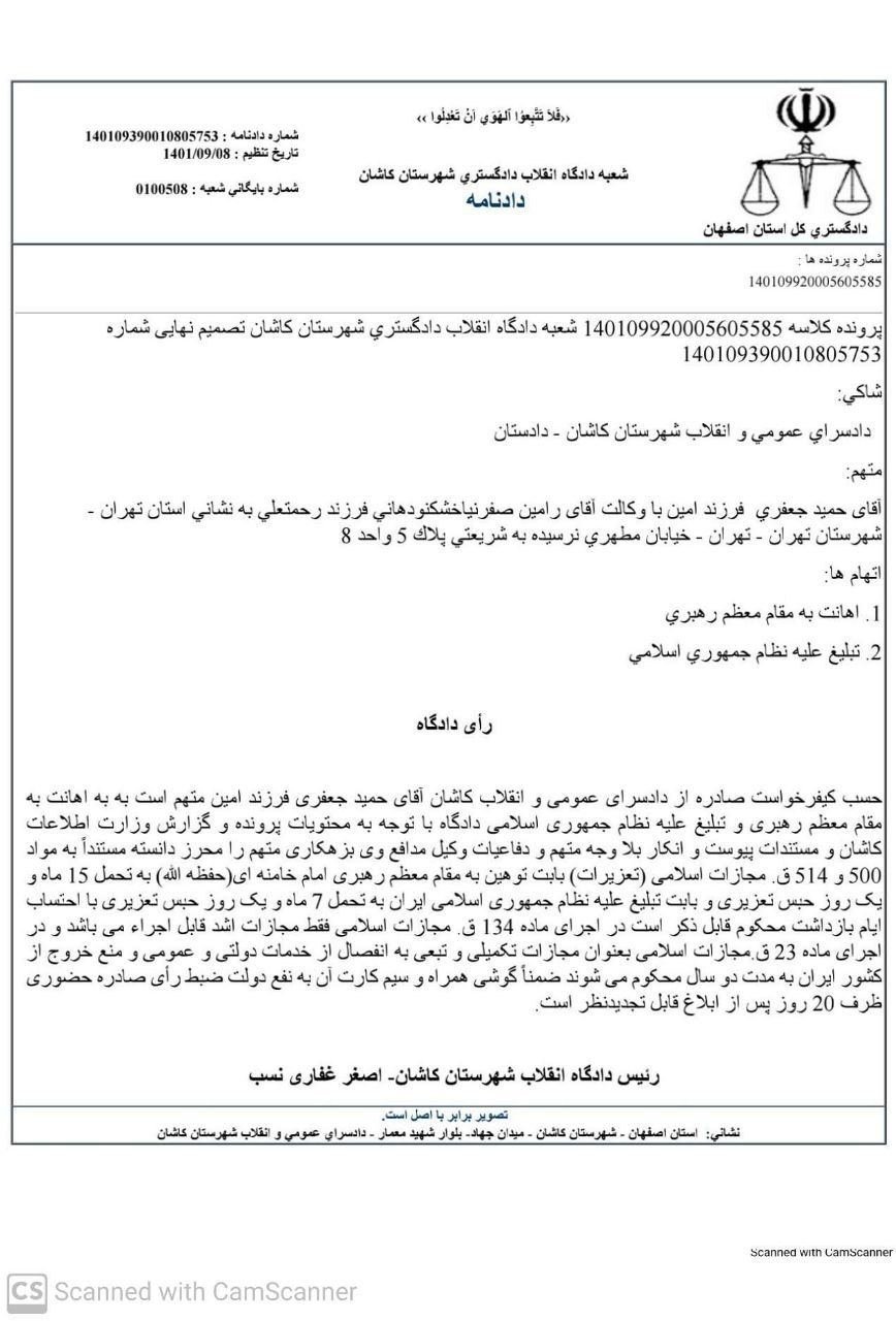 خانه/سیاست/امنیتیمحکومیت حمید جعفری نصرآبادی به ۱۵ماه و یکروز حبسخواندن1 دقیقه -شنبه 1403/06/24 - 16:52کد خبر1808اشتراکگذاری حمید جعفری نصرآبادی معلم، مترجم، مربی فوتبال و نویسنده طی حکمی از دادگاه انقلاب کاشان به دلیل توهین به رهبری به تحمل ۱۵ماه و یکروز و به اتهام تبلیغ علیه نظام به ۷ماه و یکروز حبس، ۲سال انفصال از خدمت و ۲سال ممنوعیت خروج از کشور محکوم شده است که البته مجازات اشد در صورت قطعیت حکم در دادگاه تجدید نظر استان اصفهان قابل اجرا هست.این معلم در تاریخ ۲۷ مهر در کاشان توسط اداره اطلاعات کاشان( که سهواً در متن رای دادگاه وزارت اطلاعات کاشان! درج شده) ظاهرا در مدرسه بازداشت شد و تا کنون در زندان #یزدل_کاشان بسر می برد.آنچه جالب است در این حکم علاوه بر مجازات های تَبَعی انفصال از خدمت و منع خروج از کشور؛ دادگاه در حکم خود آورده گوشی به همراه سیم کارت آن!!! به نفع دولت مصادره شود! کمتر از یک دقیقه زمان بگذارید، ثبتنام کنید و نظرتان را زیر همین پست به اشتراک بگذارید.پیامهای توهینآمیز و یا حاوی دعوت به خشونت حذف خواهند شد.ثبت نامدر ادامه بخوانید با رایزنی یک مقام ارشد و خاص، افسون علیمرادیان فعال مدنی با صدور قرار قبولی وثیقه توسط بازپرس تا رسیدگی به سایر مراحل اتهامات وی از زندان آزاد شدخواندن 1 دقیقه تازهترین رأی شعبه ۲۲ دادگاه انقلاب، ۱۴ ماه حبس تعزیری دیگر به پرونده سید مصطفی تاجزاده افزوده شدخواندن 1 دقیقه واقعا آزاده مختاری کجاستخواندن 1 دقیقه متهمی از حوادث تلخ ۱۸ و ۱۹ دی ماه و بعد میشناسید که بازداشت شده و تاکنون در هر دادگاهی محکوم به اعدام شده باشد؟خواندن 1 دقیقه پشت شوفاژ سلول ها در بند ۲۰۹، به راهروی دیگری متصل هست که سلول های دیگر هستند و عملا اگر درهای سلول ها بسته باشد به شوفاژ نمیشود زد.خواندن 2 دقیقهباید خواندخاطرات اکبر هاشمی - ۱ اسفند ۱۳۷۸ - ملاقات عبدالله جاسبی و نگرانی از نتایج انتخاباتفیلم/ سردار مرتضی طلایی کجاست؟خاطرات اکبر هاشمی - ۱۹ شهريور ۱۳۷۸ - مذاکرات دو نفره سیاسی با واعظ طبسی تا هنگام بدرقه به سوی تهران هم ادامه داشته که در نهایت هاشمی ظاهرا از اینجا تصمیم به شرکت جدی در انتخابات مجلس ششم گرفتسوابق ادوار اخیر مجلس شورای اسلامی نشان داد که مجلس در راس امور نیست و در اختیارات فرمانده کل قوا و نیروهای مسلح در هیچ سطحی نمیتواند دخالت و یا مصوبه طی کند، چه برسد که نظارت کندآینده ایران با نامزدهای اعلام شده انتخابات ریاست جمهوری چه میشود؟ / گفتگو با دکتر تقی آزاد ارمکیمیشه با شما احساس خستگی کرد؟یک دامپزشک بسیجی بجای جراح گوش و حلق و بینی سرپرست شبکه بهداشت ایذه شد!خاطرات اکبر هاشمی - ۱۴ شهريور ۱۳۷۸ - دیدار مدیران ارشد دستگاه قضایی با هاشمی رفسنجانی و گله آنان از بی توجهی هاشمی شاهرودی رییس جدید قوه قضاییه ادامه داردخاطرات اکبر هاشمی - ۱۶ شهريور ۱۳۷۸ - در ادامه تلاش های مرحوم واعظ طبسی که در دیدارهای مکرر برای تشویق هاشمی به شرکت در انتخابات اقدام میکرد این بار هم او با هاشمی ملاقات کردخاطرات اکبر هاشمی - ۱۸ شهريور ۱۳۷۸ - ادامه بازدید ها از متعلقات و ابنیه و آثار آستان قدس