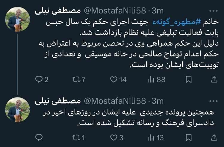 خانه/سیاست/امنیتیمطهره گونهای بازداشت شدخواندن1 دقیقه -یکشنبه 1403/07/22 - 18:23کد خبر7185اشتراکگذاری مصطفی نیلی، وکیل دادگستری نوشت: خانم مطهره گونهای جهت اجرای حکم یک سال حبس بابت فعالیت تبلیغی علیه نظام بازداشت شد.دلیل این حکم همراهی وی در تحصن مربوط به اعتراض به حکم اعدام توماج صالحی در خانه موسیقی و تعدادی از توییتهای ایشان بوده است. کمتر از یک دقیقه زمان بگذارید، ثبتنام کنید و نظرتان را زیر همین پست به اشتراک بگذارید.پیامهای توهینآمیز و یا حاوی دعوت به خشونت حذف خواهند شد.ثبت نامدر ادامه بخوانید با رایزنی یک مقام ارشد و خاص، افسون علیمرادیان فعال مدنی با صدور قرار قبولی وثیقه توسط بازپرس تا رسیدگی به سایر مراحل اتهامات وی از زندان آزاد شدخواندن 1 دقیقه تازهترین رأی شعبه ۲۲ دادگاه انقلاب، ۱۴ ماه حبس تعزیری دیگر به پرونده سید مصطفی تاجزاده افزوده شدخواندن 1 دقیقه واقعا آزاده مختاری کجاستخواندن 1 دقیقه متهمی از حوادث تلخ ۱۸ و ۱۹ دی ماه و بعد میشناسید که بازداشت شده و تاکنون در هر دادگاهی محکوم به اعدام شده باشد؟خواندن 1 دقیقه پشت شوفاژ سلول ها در بند ۲۰۹، به راهروی دیگری متصل هست که سلول های دیگر هستند و عملا اگر درهای سلول ها بسته باشد به شوفاژ نمیشود زد.خواندن 2 دقیقهباید خواندخاطرات اکبر هاشمی - ۱ اسفند ۱۳۷۸ - ملاقات عبدالله جاسبی و نگرانی از نتایج انتخاباتفیلم/ سردار مرتضی طلایی کجاست؟خاطرات اکبر هاشمی - ۱۹ شهريور ۱۳۷۸ - مذاکرات دو نفره سیاسی با واعظ طبسی تا هنگام بدرقه به سوی تهران هم ادامه داشته که در نهایت هاشمی ظاهرا از اینجا تصمیم به شرکت جدی در انتخابات مجلس ششم گرفتسوابق ادوار اخیر مجلس شورای اسلامی نشان داد که مجلس در راس امور نیست و در اختیارات فرمانده کل قوا و نیروهای مسلح در هیچ سطحی نمیتواند دخالت و یا مصوبه طی کند، چه برسد که نظارت کندآینده ایران با نامزدهای اعلام شده انتخابات ریاست جمهوری چه میشود؟ / گفتگو با دکتر تقی آزاد ارمکیمیشه با شما احساس خستگی کرد؟یک دامپزشک بسیجی بجای جراح گوش و حلق و بینی سرپرست شبکه بهداشت ایذه شد!خاطرات اکبر هاشمی - ۱۴ شهريور ۱۳۷۸ - دیدار مدیران ارشد دستگاه قضایی با هاشمی رفسنجانی و گله آنان از بی توجهی هاشمی شاهرودی رییس جدید قوه قضاییه ادامه داردخاطرات اکبر هاشمی - ۱۶ شهريور ۱۳۷۸ - در ادامه تلاش های مرحوم واعظ طبسی که در دیدارهای مکرر برای تشویق هاشمی به شرکت در انتخابات اقدام میکرد این بار هم او با هاشمی ملاقات کردخاطرات اکبر هاشمی - ۱۸ شهريور ۱۳۷۸ - ادامه بازدید ها از متعلقات و ابنیه و آثار آستان قدس