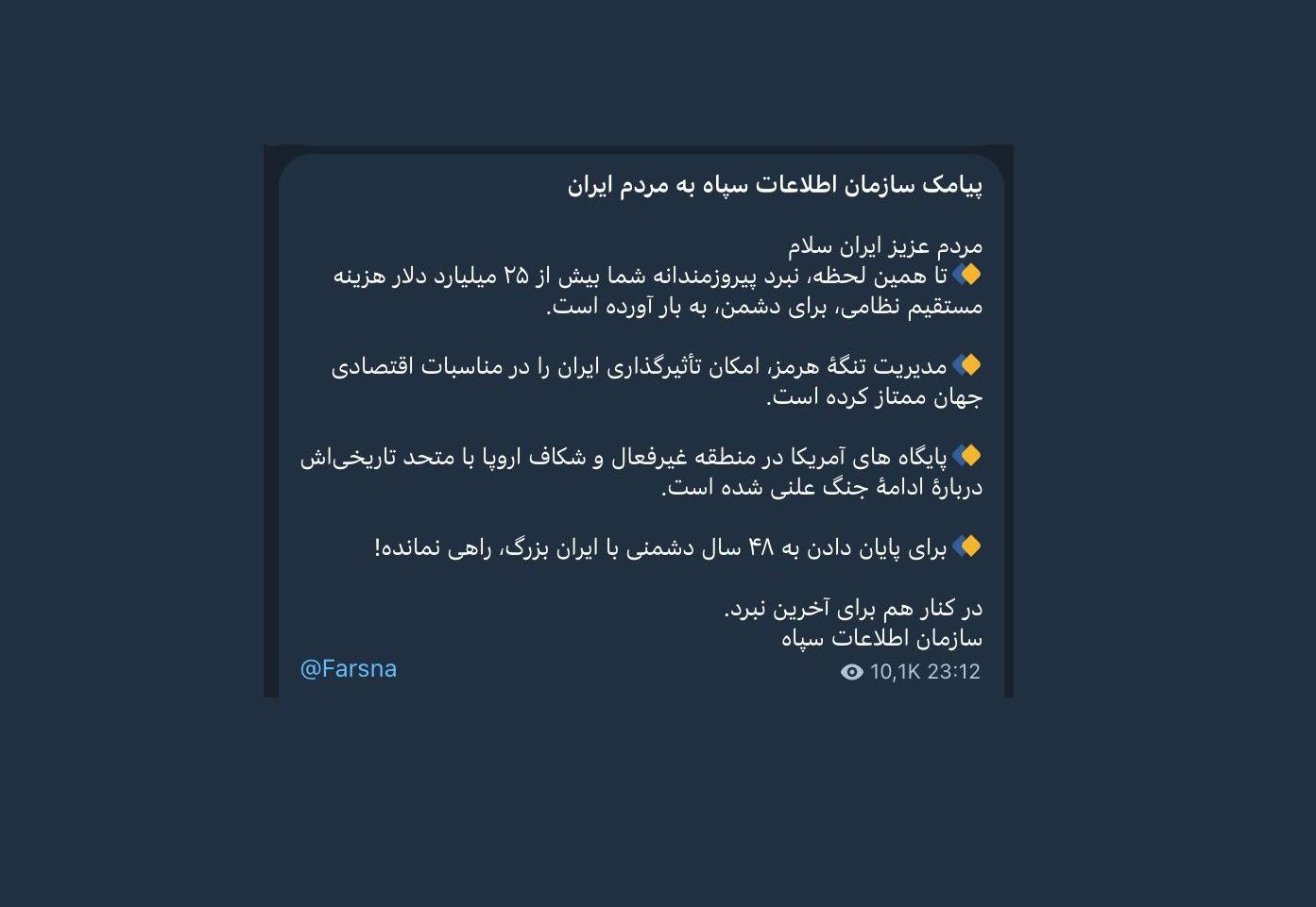 خانه/سیاستسپاه معترضان را تهدید به مقابلهای شدیدتر از دیماه کرد خواندن1 دقیقه -چهارشنبه 1405/02/09 - 14:40کد خبر24623اشتراکگذاری سازمان اطلاعات سپاه پاسداران در بیانیهای خطاب به "مردم ایران" معترضان را به مقابلهای شدیدتر از دیماه تهدید کرده است.سازمان اطلاعات سپاه پاسداران در بیانیهای خطاب به "مردم ایران" معترضان را به مقابلهای شدیدتر از دیماه تهدید کرده است.سپاه اعلام کرد: «اکنون دشمن شرور و مستأصل در دستیابی به اهداف نبرد میدانی، دوباره القاء ترس و آشوب خیابانی را دنبال میکند؛ البته ضربهای محکمتر از ۱۸ دی در انتظار نوداعشیهاست».سپاه با بیان این که در بیانیه اول اعتراضات خیابانی را "مقدمه ضربه نظامی" خوانده معترضان را "بیوطن" نامید و تهدید کرد: «مبارزه شبانهروزی با بیوطنهای داخلی با ما». کمتر از یک دقیقه زمان بگذارید، ثبتنام کنید و نظرتان را زیر همین پست به اشتراک بگذارید.پیامهای توهینآمیز و یا حاوی دعوت به خشونت حذف خواهند شد.ثبت نامدر ادامه بخوانید رهبر در شورای عالی امنیت ملی دو نماینده دارد همانطور که در شورای دفاع اینگونه استخواندن 1 دقیقه رهبر منصوب نمادین منتقدان جمهوری اسلامی و پدیده ولایت موروثیخواندن 4 دقیقه دریادار یا دریا سالار؟خواندن 1 دقیقه چه کسی بر پیکر آیتالله خامنهای نماز خواهد خواند؟خواندن 1 دقیقه عواقب ارزیابی های نادرست به روایت جواد منصوریخواندن 3 دقیقهباید خواندخاطرات اکبر هاشمی - ۱ اسفند ۱۳۷۸ - ملاقات عبدالله جاسبی و نگرانی از نتایج انتخاباتفیلم/ سردار مرتضی طلایی کجاست؟خاطرات اکبر هاشمی - ۱۹ شهريور ۱۳۷۸ - مذاکرات دو نفره سیاسی با واعظ طبسی تا هنگام بدرقه به سوی تهران هم ادامه داشته که در نهایت هاشمی ظاهرا از اینجا تصمیم به شرکت جدی در انتخابات مجلس ششم گرفتسوابق ادوار اخیر مجلس شورای اسلامی نشان داد که مجلس در راس امور نیست و در اختیارات فرمانده کل قوا و نیروهای مسلح در هیچ سطحی نمیتواند دخالت و یا مصوبه طی کند، چه برسد که نظارت کندآینده ایران با نامزدهای اعلام شده انتخابات ریاست جمهوری چه میشود؟ / گفتگو با دکتر تقی آزاد ارمکیمیشه با شما احساس خستگی کرد؟یک دامپزشک بسیجی بجای جراح گوش و حلق و بینی سرپرست شبکه بهداشت ایذه شد!خاطرات اکبر هاشمی - ۱۴ شهريور ۱۳۷۸ - دیدار مدیران ارشد دستگاه قضایی با هاشمی رفسنجانی و گله آنان از بی توجهی هاشمی شاهرودی رییس جدید قوه قضاییه ادامه داردخاطرات اکبر هاشمی - ۱۶ شهريور ۱۳۷۸ - در ادامه تلاش های مرحوم واعظ طبسی که در دیدارهای مکرر برای تشویق هاشمی به شرکت در انتخابات اقدام میکرد این بار هم او با هاشمی ملاقات کردخاطرات اکبر هاشمی - ۱۸ شهريور ۱۳۷۸ - ادامه بازدید ها از متعلقات و ابنیه و آثار آستان قدس