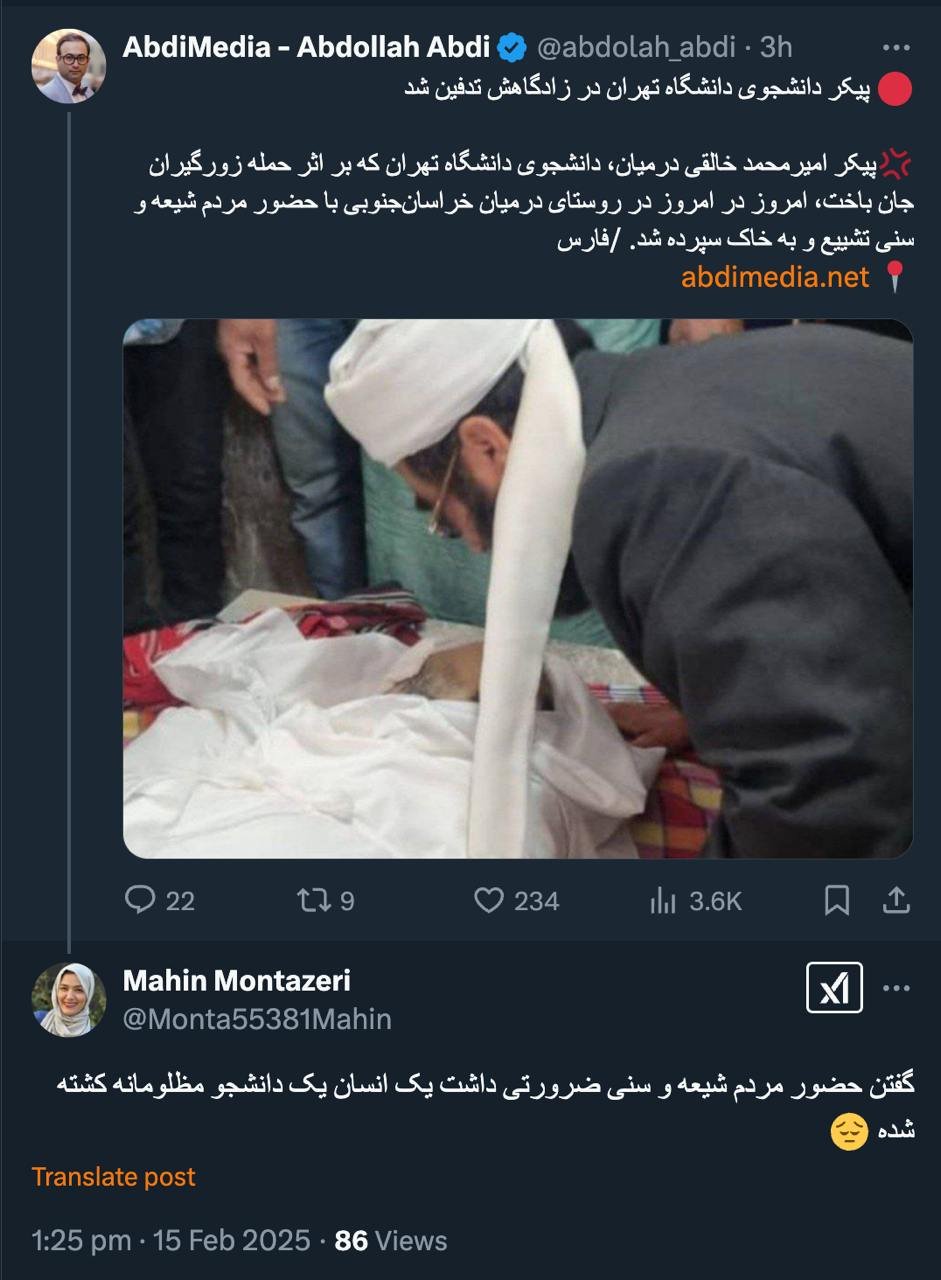 خانه/اجتماعی اولا نقل قول از خبرگزاری فارس هست و قید کردهام. و بعد هم اتحاد مذاهب و مسلمانان در مقابل یک جنایت مظلومانه را تداعی میکند.خواندن1 دقیقه -شنبه 1403/11/27 - 19:08کد خبر13564اشتراکگذاری گفتن حضور مردم شیعه و سنی ضرورتی داشت یک انسان یک دانشجو مظلومانه کشته شده 😔— Mahin Montazeri (@Monta55381Mahin) February 15, 2025🔴 دروداولا نقل قول از خبرگزاری فارس هست و قید کردهام.💢و بعد هم اتحاد مذاهب و مسلمانان در مقابل یک جنایت مظلومانه را تداعی میکند.📍 https://t.co/EJ1otLIXZf— AbdiMedia - Abdollah Abdi (@abdolah_abdi) February 15, 2025اخبار مرتبط پیکر دانشجوی دانشگاه تهران در زادگاهش تدفین شد کمتر از یک دقیقه زمان بگذارید، ثبتنام کنید و نظرتان را زیر همین پست به اشتراک بگذارید.پیامهای توهینآمیز و یا حاوی دعوت به خشونت حذف خواهند شد.ثبت نامدر ادامه بخوانید اخباری از سرقت منازل و مغازه ها و در مواردی سرقت گوشی موبایل شهروندان به عبدی مدیا واصل شده و در مواردی تسویه حساب های شخصیخواندن 1 دقیقه واقعیت، تلختر و دهشتناکتر از این پست هاست که اشاره کردهایدخواندن 1 دقیقه با جعل هویت در شبکه ایکس برای ایرانیان چه باید کرد؟خواندن 1 دقیقه سال نوی میلادی را در حالی آغاز میکنیم که ایرانِ جانمان، سالی سنگین و پرحادثه را پشت سر گذاشته استخواندن 1 دقیقه عدم پذیرش بیماران بیمه سلامت با تعرفه دولتی (به جز موارد اورژانسی، بیماران خاص، صعب العلاج و سوختگی)خواندن 1 دقیقهباید خواندخاطرات اکبر هاشمی - ۱ اسفند ۱۳۷۸ - ملاقات عبدالله جاسبی و نگرانی از نتایج انتخاباتفیلم/ سردار مرتضی طلایی کجاست؟خاطرات اکبر هاشمی - ۱۹ شهريور ۱۳۷۸ - مذاکرات دو نفره سیاسی با واعظ طبسی تا هنگام بدرقه به سوی تهران هم ادامه داشته که در نهایت هاشمی ظاهرا از اینجا تصمیم به شرکت جدی در انتخابات مجلس ششم گرفتسوابق ادوار اخیر مجلس شورای اسلامی نشان داد که مجلس در راس امور نیست و در اختیارات فرمانده کل قوا و نیروهای مسلح در هیچ سطحی نمیتواند دخالت و یا مصوبه طی کند، چه برسد که نظارت کندآینده ایران با نامزدهای اعلام شده انتخابات ریاست جمهوری چه میشود؟ / گفتگو با دکتر تقی آزاد ارمکیمیشه با شما احساس خستگی کرد؟یک دامپزشک بسیجی بجای جراح گوش و حلق و بینی سرپرست شبکه بهداشت ایذه شد!خاطرات اکبر هاشمی - ۱۴ شهريور ۱۳۷۸ - دیدار مدیران ارشد دستگاه قضایی با هاشمی رفسنجانی و گله آنان از بی توجهی هاشمی شاهرودی رییس جدید قوه قضاییه ادامه داردخاطرات اکبر هاشمی - ۱۶ شهريور ۱۳۷۸ - در ادامه تلاش های مرحوم واعظ طبسی که در دیدارهای مکرر برای تشویق هاشمی به شرکت در انتخابات اقدام میکرد این بار هم او با هاشمی ملاقات کردخاطرات اکبر هاشمی - ۱۸ شهريور ۱۳۷۸ - ادامه بازدید ها از متعلقات و ابنیه و آثار آستان قدس