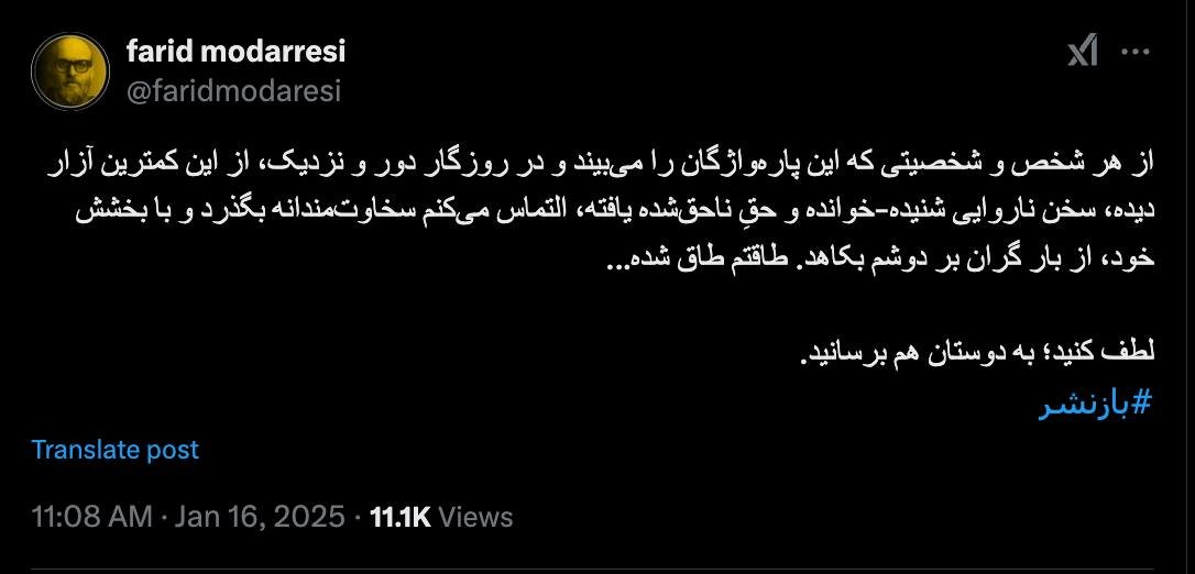 خانه/اجتماعیآقای فرید مدرسی عزیز درود اختلاف سلیقه و برداشت لازمه ی رشد است، انتقاد پذیری هم. دغدغه های شما نیز ارزشمند است و قابل احترام مهم انسانیت است و رعایت اخلاق. برای شفای عاجل و سلامت شما دعا کرده و همچنان دعا میکنم. خواندن1 دقیقه -پنجشنبه 1403/10/27 - 20:18کد خبر11836اشتراکگذاری زود خوب میشوید و همچنان پرشور و هیجان نقد خواهید کرد و توییت هایتان را خواهیم خواند و گاهی باهم با رعایت اخلاق احتمالا چالش خواهیم داشت استوار باش مرداز هر شخص و شخصیتی که این پارهواژگان را میبیند و در روزگار دور و نزدیک، از این کمترین آزار دیده، سخن ناروایی شنیده-خوانده و حقِ ناحقشده یافته، التماس میکنم سخاوتمندانه بگذرد و با بخشش خود، از بار گران بر دوشم بکاهد. طاقتم طاق شده...لطف کنید؛ به دوستان هم برسانید.#بازنشر— farid modarresi (@faridmodaresi) January 16, 2025🔴 آقای فرید مدرسی عزیز، دروداختلاف سلیقه و برداشت لازمه ی رشد است، انتقاد پذیری همدغدغه های شما نیز ارزشمند است و قابل احتراممهم انسانیت است و رعایت اخلاقبرای شفای عاجل و سلامت شما دعا کرده و همچنان دعا میکنم.زود خوب میشوید و همچنان پرشور و هیجان نقد خواهید کرد و توییت…— AbdiMedia - Abdollah Abdi (@abdolah_abdi) January 16, 2025 کمتر از یک دقیقه زمان بگذارید، ثبتنام کنید و نظرتان را زیر همین پست به اشتراک بگذارید.پیامهای توهینآمیز و یا حاوی دعوت به خشونت حذف خواهند شد.ثبت نامدر ادامه بخوانید اخباری از سرقت منازل و مغازه ها و در مواردی سرقت گوشی موبایل شهروندان به عبدی مدیا واصل شده و در مواردی تسویه حساب های شخصیخواندن 1 دقیقه واقعیت، تلختر و دهشتناکتر از این پست هاست که اشاره کردهایدخواندن 1 دقیقه با جعل هویت در شبکه ایکس برای ایرانیان چه باید کرد؟خواندن 1 دقیقه سال نوی میلادی را در حالی آغاز میکنیم که ایرانِ جانمان، سالی سنگین و پرحادثه را پشت سر گذاشته استخواندن 1 دقیقه عدم پذیرش بیماران بیمه سلامت با تعرفه دولتی (به جز موارد اورژانسی، بیماران خاص، صعب العلاج و سوختگی)خواندن 1 دقیقهباید خواندخاطرات اکبر هاشمی - ۱ اسفند ۱۳۷۸ - ملاقات عبدالله جاسبی و نگرانی از نتایج انتخاباتفیلم/ سردار مرتضی طلایی کجاست؟خاطرات اکبر هاشمی - ۱۹ شهريور ۱۳۷۸ - مذاکرات دو نفره سیاسی با واعظ طبسی تا هنگام بدرقه به سوی تهران هم ادامه داشته که در نهایت هاشمی ظاهرا از اینجا تصمیم به شرکت جدی در انتخابات مجلس ششم گرفتسوابق ادوار اخیر مجلس شورای اسلامی نشان داد که مجلس در راس امور نیست و در اختیارات فرمانده کل قوا و نیروهای مسلح در هیچ سطحی نمیتواند دخالت و یا مصوبه طی کند، چه برسد که نظارت کندآینده ایران با نامزدهای اعلام شده انتخابات ریاست جمهوری چه میشود؟ / گفتگو با دکتر تقی آزاد ارمکیمیشه با شما احساس خستگی کرد؟یک دامپزشک بسیجی بجای جراح گوش و حلق و بینی سرپرست شبکه بهداشت ایذه شد!خاطرات اکبر هاشمی - ۱۴ شهريور ۱۳۷۸ - دیدار مدیران ارشد دستگاه قضایی با هاشمی رفسنجانی و گله آنان از بی توجهی هاشمی شاهرودی رییس جدید قوه قضاییه ادامه داردخاطرات اکبر هاشمی - ۱۶ شهريور ۱۳۷۸ - در ادامه تلاش های مرحوم واعظ طبسی که در دیدارهای مکرر برای تشویق هاشمی به شرکت در انتخابات اقدام میکرد این بار هم او با هاشمی ملاقات کردخاطرات اکبر هاشمی - ۱۸ شهريور ۱۳۷۸ - ادامه بازدید ها از متعلقات و ابنیه و آثار آستان قدس