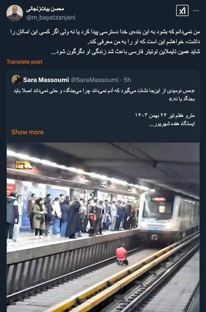 خانه/اجتماعیدرود بر شما و نیت خیرخواهانه تان امیدوارم مسئولان مربوطه نگویند درد او نمایش بود و یا مشکلات روانی داشت یا ده ها مورد دیگر پیشنهاد میشود همراهان گرامی او را یافته و به آقای محسن بیات زنجانی معرفی کنند خواندن1 دقیقه -جمعه 1403/11/26 - 00:59کد خبر13485اشتراکگذاری کاش و صد کاش که سازمان بهزیستی کشور این قدر امکانات داشت تا این آسیب های اجتماعی رو به رشد را جدی میگرفت. من نمیدانم که بشود به این بندهی خدا دسترسی پیدا کرد یا نه ولی اگر کسی این امکان را داشت، خواهشم این است که او را به من معرفی کند.شاید همین تایملاین توئیتر فارسی باعث شد زندگی او دگرگون شود… https://t.co/9URUSlD98v— محسن بیاتزنجانی (@m_bayatzanjani) February 13, 2025🔴 درود بر شما و نیت خیرخواهانه تان💢 امیدوارم مسئولان مربوطه نگویند درد او نمایش بود و یا مشکلات روانی داشت یا ده ها مورد دیگر📌 پیشنهاد میشود همراهان گرامی او را یافته و به آقای محسن بیات زنجانی معرفی کنند📌 کاش و صد کاش که سازمان بهزیستی کشور این قدر امکانات داشت تا این…— AbdiMedia - Abdollah Abdi (@abdolah_abdi) February 13, 2025 کمتر از یک دقیقه زمان بگذارید، ثبتنام کنید و نظرتان را زیر همین پست به اشتراک بگذارید.پیامهای توهینآمیز و یا حاوی دعوت به خشونت حذف خواهند شد.ثبت نامدر ادامه بخوانید اخباری از سرقت منازل و مغازه ها و در مواردی سرقت گوشی موبایل شهروندان به عبدی مدیا واصل شده و در مواردی تسویه حساب های شخصیخواندن 1 دقیقه واقعیت، تلختر و دهشتناکتر از این پست هاست که اشاره کردهایدخواندن 1 دقیقه با جعل هویت در شبکه ایکس برای ایرانیان چه باید کرد؟خواندن 1 دقیقه سال نوی میلادی را در حالی آغاز میکنیم که ایرانِ جانمان، سالی سنگین و پرحادثه را پشت سر گذاشته استخواندن 1 دقیقه عدم پذیرش بیماران بیمه سلامت با تعرفه دولتی (به جز موارد اورژانسی، بیماران خاص، صعب العلاج و سوختگی)خواندن 1 دقیقهباید خواندخاطرات اکبر هاشمی - ۱ اسفند ۱۳۷۸ - ملاقات عبدالله جاسبی و نگرانی از نتایج انتخاباتفیلم/ سردار مرتضی طلایی کجاست؟خاطرات اکبر هاشمی - ۱۹ شهريور ۱۳۷۸ - مذاکرات دو نفره سیاسی با واعظ طبسی تا هنگام بدرقه به سوی تهران هم ادامه داشته که در نهایت هاشمی ظاهرا از اینجا تصمیم به شرکت جدی در انتخابات مجلس ششم گرفتسوابق ادوار اخیر مجلس شورای اسلامی نشان داد که مجلس در راس امور نیست و در اختیارات فرمانده کل قوا و نیروهای مسلح در هیچ سطحی نمیتواند دخالت و یا مصوبه طی کند، چه برسد که نظارت کندآینده ایران با نامزدهای اعلام شده انتخابات ریاست جمهوری چه میشود؟ / گفتگو با دکتر تقی آزاد ارمکیمیشه با شما احساس خستگی کرد؟یک دامپزشک بسیجی بجای جراح گوش و حلق و بینی سرپرست شبکه بهداشت ایذه شد!خاطرات اکبر هاشمی - ۱۴ شهريور ۱۳۷۸ - دیدار مدیران ارشد دستگاه قضایی با هاشمی رفسنجانی و گله آنان از بی توجهی هاشمی شاهرودی رییس جدید قوه قضاییه ادامه داردخاطرات اکبر هاشمی - ۱۶ شهريور ۱۳۷۸ - در ادامه تلاش های مرحوم واعظ طبسی که در دیدارهای مکرر برای تشویق هاشمی به شرکت در انتخابات اقدام میکرد این بار هم او با هاشمی ملاقات کردخاطرات اکبر هاشمی - ۱۸ شهريور ۱۳۷۸ - ادامه بازدید ها از متعلقات و ابنیه و آثار آستان قدس