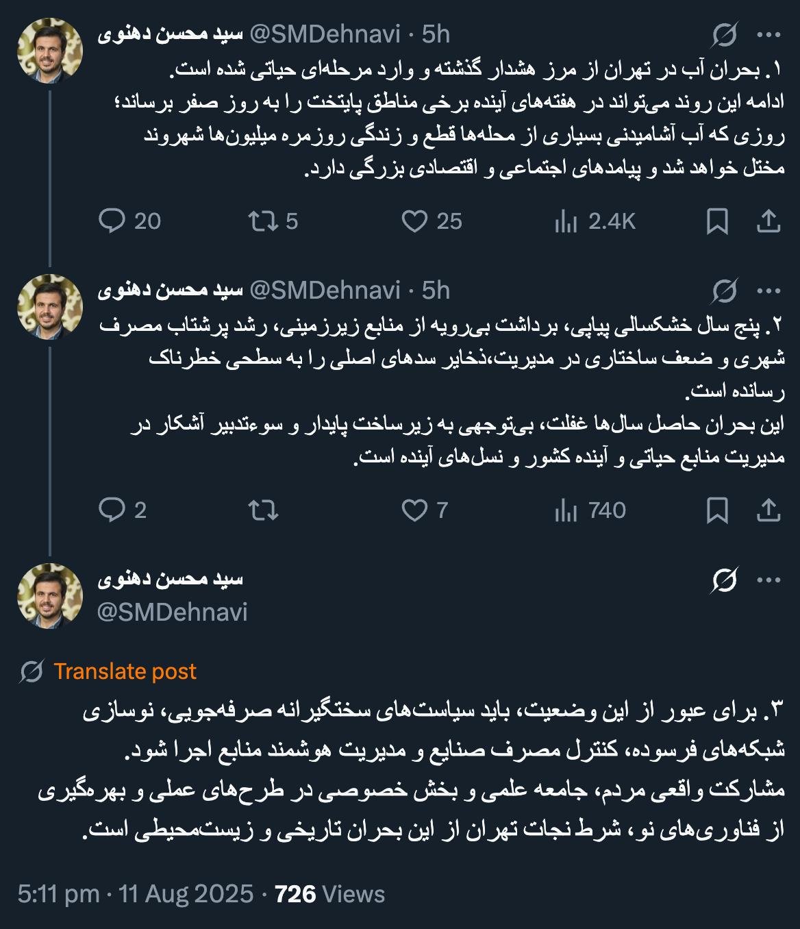 خانه/اجتماعی سخنگوی مجمع تشخیص مصلحت نظام در توییتی که مشخص نیست از جایگاه حقوقی وی هست یا شخصیت حقیقی از امکان قطعی گسترده آب تهران در هفته های آتی می گویدخواندن0 -سه شنبه 1404/05/21 - 14:56کد خبر21962اشتراکگذاری کمتر از یک دقیقه زمان بگذارید، ثبتنام کنید و نظرتان را زیر همین پست به اشتراک بگذارید.پیامهای توهینآمیز و یا حاوی دعوت به خشونت حذف خواهند شد.ثبت نامدر ادامه بخوانید اخباری از سرقت منازل و مغازه ها و در مواردی سرقت گوشی موبایل شهروندان به عبدی مدیا واصل شده و در مواردی تسویه حساب های شخصیخواندن 1 دقیقه واقعیت، تلختر و دهشتناکتر از این پست هاست که اشاره کردهایدخواندن 1 دقیقه با جعل هویت در شبکه ایکس برای ایرانیان چه باید کرد؟خواندن 1 دقیقه سال نوی میلادی را در حالی آغاز میکنیم که ایرانِ جانمان، سالی سنگین و پرحادثه را پشت سر گذاشته استخواندن 1 دقیقه عدم پذیرش بیماران بیمه سلامت با تعرفه دولتی (به جز موارد اورژانسی، بیماران خاص، صعب العلاج و سوختگی)خواندن 1 دقیقهباید خواندخاطرات اکبر هاشمی - ۱ اسفند ۱۳۷۸ - ملاقات عبدالله جاسبی و نگرانی از نتایج انتخاباتفیلم/ سردار مرتضی طلایی کجاست؟خاطرات اکبر هاشمی - ۱۹ شهريور ۱۳۷۸ - مذاکرات دو نفره سیاسی با واعظ طبسی تا هنگام بدرقه به سوی تهران هم ادامه داشته که در نهایت هاشمی ظاهرا از اینجا تصمیم به شرکت جدی در انتخابات مجلس ششم گرفتسوابق ادوار اخیر مجلس شورای اسلامی نشان داد که مجلس در راس امور نیست و در اختیارات فرمانده کل قوا و نیروهای مسلح در هیچ سطحی نمیتواند دخالت و یا مصوبه طی کند، چه برسد که نظارت کندآینده ایران با نامزدهای اعلام شده انتخابات ریاست جمهوری چه میشود؟ / گفتگو با دکتر تقی آزاد ارمکیمیشه با شما احساس خستگی کرد؟یک دامپزشک بسیجی بجای جراح گوش و حلق و بینی سرپرست شبکه بهداشت ایذه شد!خاطرات اکبر هاشمی - ۱۴ شهريور ۱۳۷۸ - دیدار مدیران ارشد دستگاه قضایی با هاشمی رفسنجانی و گله آنان از بی توجهی هاشمی شاهرودی رییس جدید قوه قضاییه ادامه داردخاطرات اکبر هاشمی - ۱۶ شهريور ۱۳۷۸ - در ادامه تلاش های مرحوم واعظ طبسی که در دیدارهای مکرر برای تشویق هاشمی به شرکت در انتخابات اقدام میکرد این بار هم او با هاشمی ملاقات کردخاطرات اکبر هاشمی - ۱۸ شهريور ۱۳۷۸ - ادامه بازدید ها از متعلقات و ابنیه و آثار آستان قدس