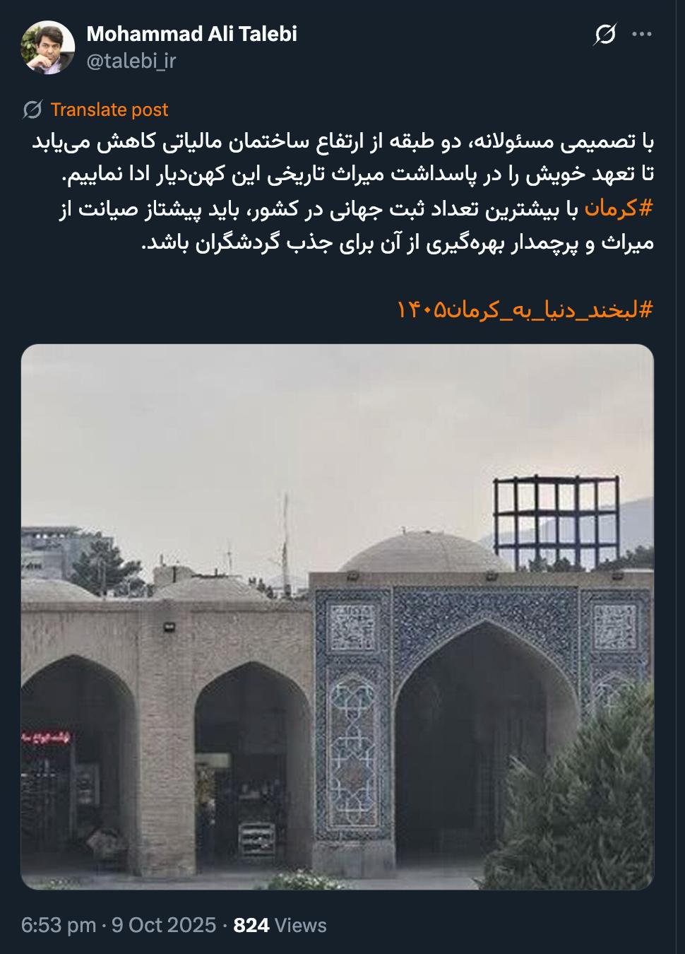 خانه/اجتماعیدرود بر استاندار سخت کوش دیار مهربانی کرمانخواندن1 دقیقه -شنبه 1404/07/19 - 10:26کد خبر23018اشتراکگذاری با تصمیمی مسئولانه، دو طبقه از ارتفاع ساختمان مالیاتی کاهش مییابد تا تعهد خویش را در پاسداشت میراث تاریخی این کهندیار ادا نماییم.#کرمان با بیشترین تعداد ثبت جهانی در کشور، باید پیشتاز صیانت از میراث و پرچمدار بهرهگیری از آن برای جذب گردشگران باشد.#لبخند_دنیا_به_کرمان۱۴۰۵ pic.twitter.com/B7VqWx5oEP— Mohammad Ali Talebi (@talebi_ir) October 9, 2025🔴 درود بر استاندار سخت کوش دیار مهربانی کرمان— AbdiMedia - Abdollah Abdi (@abdolah_abdi) October 10, 2025 کمتر از یک دقیقه زمان بگذارید، ثبتنام کنید و نظرتان را زیر همین پست به اشتراک بگذارید.پیامهای توهینآمیز و یا حاوی دعوت به خشونت حذف خواهند شد.ثبت نامدر ادامه بخوانید اخباری از سرقت منازل و مغازه ها و در مواردی سرقت گوشی موبایل شهروندان به عبدی مدیا واصل شده و در مواردی تسویه حساب های شخصیخواندن 1 دقیقه واقعیت، تلختر و دهشتناکتر از این پست هاست که اشاره کردهایدخواندن 1 دقیقه با جعل هویت در شبکه ایکس برای ایرانیان چه باید کرد؟خواندن 1 دقیقه سال نوی میلادی را در حالی آغاز میکنیم که ایرانِ جانمان، سالی سنگین و پرحادثه را پشت سر گذاشته استخواندن 1 دقیقه عدم پذیرش بیماران بیمه سلامت با تعرفه دولتی (به جز موارد اورژانسی، بیماران خاص، صعب العلاج و سوختگی)خواندن 1 دقیقهباید خواندخاطرات اکبر هاشمی - ۱ اسفند ۱۳۷۸ - ملاقات عبدالله جاسبی و نگرانی از نتایج انتخاباتفیلم/ سردار مرتضی طلایی کجاست؟خاطرات اکبر هاشمی - ۱۹ شهريور ۱۳۷۸ - مذاکرات دو نفره سیاسی با واعظ طبسی تا هنگام بدرقه به سوی تهران هم ادامه داشته که در نهایت هاشمی ظاهرا از اینجا تصمیم به شرکت جدی در انتخابات مجلس ششم گرفتسوابق ادوار اخیر مجلس شورای اسلامی نشان داد که مجلس در راس امور نیست و در اختیارات فرمانده کل قوا و نیروهای مسلح در هیچ سطحی نمیتواند دخالت و یا مصوبه طی کند، چه برسد که نظارت کندآینده ایران با نامزدهای اعلام شده انتخابات ریاست جمهوری چه میشود؟ / گفتگو با دکتر تقی آزاد ارمکیمیشه با شما احساس خستگی کرد؟یک دامپزشک بسیجی بجای جراح گوش و حلق و بینی سرپرست شبکه بهداشت ایذه شد!خاطرات اکبر هاشمی - ۱۴ شهريور ۱۳۷۸ - دیدار مدیران ارشد دستگاه قضایی با هاشمی رفسنجانی و گله آنان از بی توجهی هاشمی شاهرودی رییس جدید قوه قضاییه ادامه داردخاطرات اکبر هاشمی - ۱۶ شهريور ۱۳۷۸ - در ادامه تلاش های مرحوم واعظ طبسی که در دیدارهای مکرر برای تشویق هاشمی به شرکت در انتخابات اقدام میکرد این بار هم او با هاشمی ملاقات کردخاطرات اکبر هاشمی - ۱۸ شهريور ۱۳۷۸ - ادامه بازدید ها از متعلقات و ابنیه و آثار آستان قدس