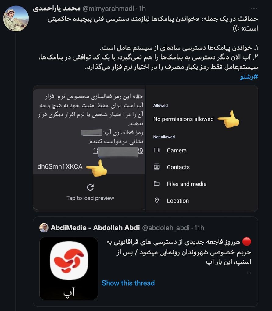 خانه/یادداشت ویژه توجیهات عجیب و واکنش شتابزده مدیر محصول آپ به مطلب عبدی مدیاخواندن2 دقیقه -چهارشنبه 1403/06/28 - 09:13کد خبر2419اشتراکگذاریتصویر تصویر تصویر PreviousNextپاسخم به توجیهات عجیب و واکنش شتابزده مدیر محصول آپ جناب آقای یار احمدی، مدیر محترم محصول آپسلامواقعا خودتان به جای انتساب اتهام به اینجانب به سایت های مجهول الحال و قمار و …که خنده دار و تاسف بار است، به آنچه که توضیح مثلا فنی فرمودید باور دارید؟من جزییات بسیار بیشتری را از مبادی مورد وثوق برای دخالت و جمع آوری اطلاعات آپ دارم که برای پرهیز از موارد جنبی عمومی فعلا تا یقین به صحت آنها نکنم منتشر نکردم.حتی دفتر امنیت شبکه سازمان تنظیم مقررات و ارتباطات رادیویی هم در مواردی به پشتوانه همان حمایتهای عظیم از آپ نتوانسته حریف «آپ» شود چه در دولت قبلی و چه در دولت فعلی انقلابیبا به روز رسانی آپ و ارسال رمز یک بار مصرف در حالیکه بطور پیش فرض اجازه خواندن پیامکها را میگیرید و کمتر مشترکی این اجازه را نمی دهد و استفاده و در حقیقت سو استفاده محتمل - فعلا نمیخواهم آپ را متهم به آن بکنم- به ارسال و دریافت و مدیریت پیامکهای شهروندان البته با تایید خودشان که غالبا بدون اطلاع و توجه لازم است دسترسی دارید وخودتان بهتر میدانید یعنی چه؟با توجیهات دیگرتان بنام توضیحات؛ که حتی مغایر با بخش و سر فصل امنیتی قرارداد خودتان با رگولاتوری است، نمیتوانید صورت اصلِ مسئله را پاک کنید.من نخواستم وارد استفاده محتمل ؛ دقت بفرمایید نوشتم محتمل ؛ مراجع خاص دیگر برای تماسهای صوتی و تصویریِ دوربین و میکروفون هم بشوم که این امر البته موضوع مبتلا به عام همه برنامه ها واَپ های داخلی است.بخصوص در ارتباط با امور پزشکی وغذایی که از خصوصیترین امور اشخاص است که خودتان اشاره فرمودید ومن فعلا نمیخواهم چیزی بنویسم به همان علت که در صدر یادداشت اشاره کردم.یادداشت من مبتنی بر یک هشدار جدی امنیتی به حامیان خاص آپ و سپس وزارت ارتباطات و فناوری اطلاعات و سازمان تنظیم مقررات وارتباطات رادیویی و بویژه معاونین تنظیم مقررات و همچنین امنیت مرکز ملی فضای مجازی است که پیام من به آنها با صدای بلند رسید.از واکنش سریع شما هم متشکرم وعینا آن را برای اهل فن و شهروندان محترم در کانال تلگرامی هم بازنشر خواهم کرد تا اخلاق حرفهای رسانهای را هم رعایت کرده باشم.فقط بدانید خیلی از شما بزرگتر و قدرتمندتر به دنبال یک ضعف کوچک از من هستند و اگر تا الان کوچکترین خلاف یا شبههای خصوصا مالی و ارتباطی یا جانبداری به نفع گروهها و بدنه ویا هرم قدرت و اشخاص خاص قدرتمند مالی و سیاسی و رانت خوار درون وبرون حاکمیت از من سر زده بود، گوش فلک را کر میکردند.موفق باشید. کمتر از یک دقیقه زمان بگذارید، ثبتنام کنید و نظرتان را زیر همین پست به اشتراک بگذارید.پیامهای توهینآمیز و یا حاوی دعوت به خشونت حذف خواهند شد.ثبت نامدر ادامه بخوانید و بالاخره بصورت رسمی خبر کشته شدن رهبر جمهوری اسلامی تایید شد...خواندن 0 بازنشر - متن بخشنامه ۲۸ آذر ماه ۱۳۶۳ شورای عالی قضایی به کلیه دادگاه ها و دادسراهای ایران مبنی بر پذیرش وکلاءخواندن 1 دقیقه این «آرامشِ پرهزینه»، بهترین شرایط برای کاملکردن حلقه امنیت داخلی بود.خواندن 1 دقیقه اینترنت چه زمانی و تحت چه شرایطی وصل میشود؟ پاسخ در خیابان، دریا و آسمان استخواندن 4 دقیقه سیاست بازپسگیری خیابان؛ از کنترل تا آغاز برخورد سختخواندن 3 دقیقهباید خواندخاطرات اکبر هاشمی - ۱ اسفند ۱۳۷۸ - ملاقات عبدالله جاسبی و نگرانی از نتایج انتخاباتفیلم/ سردار مرتضی طلایی کجاست؟خاطرات اکبر هاشمی - ۱۹ شهريور ۱۳۷۸ - مذاکرات دو نفره سیاسی با واعظ طبسی تا هنگام بدرقه به سوی تهران هم ادامه داشته که در نهایت هاشمی ظاهرا از اینجا تصمیم به شرکت جدی در انتخابات مجلس ششم گرفتسوابق ادوار اخیر مجلس شورای اسلامی نشان داد که مجلس در راس امور نیست و در اختیارات فرمانده کل قوا و نیروهای مسلح در هیچ سطحی نمیتواند دخال