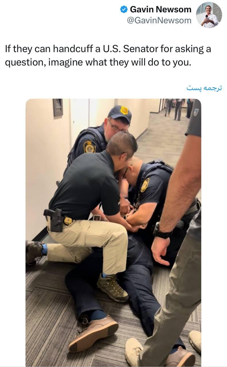 خانه/بینالمللبا سناتور این طور برخورد می کنند، فکرش را بکنید با شما چه می کنندخواندن1 دقیقه -جمعه 1404/03/23 - 10:18کد خبر19576اشتراکگذاری گوین نیوسام، فرماندار کالیفرنیا به بازداشت «الکس پادیلا» سناتور این ایالت توسط عوامل گوین نیوسام، فرماندار کالیفرنیا به بازداشت «الکس پادیلا» سناتور این ایالت توسط عوامل امنیتی واکنش نشان داد: اگر میتوانند یک سناتور آمریکایی را به خاطر پرسیدن یک سوال دستبند بزنند، تصور کنید با شما چه خواهند کرد. کمتر از یک دقیقه زمان بگذارید، ثبتنام کنید و نظرتان را زیر همین پست به اشتراک بگذارید.پیامهای توهینآمیز و یا حاوی دعوت به خشونت حذف خواهند شد.ثبت نامدر ادامه بخوانید خبرنگاری با اشاره به حضور استیو ویتکاف و جرد کوشنر و همچنین برد کوپر، رئیس ستاد فرماندهی مرکزی آمریکا در مذاکرات با جمهوری اسلامی در عمان، از دونالد ترامپ پرسید...خواندن 1 دقیقه ترامپ: ما مذاکرات بسیار خوبی درباره ایران داشتیم و به نظر میرسد که ایران به شدت تمایل به دستیابی به توافق دارد.خواندن 1 دقیقه وزارت خارجۀ ایالات متحده بازداشت مصطفی تاجزاده در ایام مرخصی از زندان و انتقال او به اوین را نمایانگر «بیاعتنایی آشکار جمهوری اسلامی به اصول و شرافت انسانی و عدالت» خواند.خواندن 1 دقیقه اطلاعیه و هشدار آمریکا به فارسیخواندن 0 ترامپ درباره اینکه چگونه حماس را به پذیرش توافق واداشت: من کمی محکم صحبت کردم و همین کافی بود. این همان چیزی است که در چنین دنیای سختی جواب میدهد: باید محکم حرف بزنی.خواندن 1 دقیقهباید خواندخاطرات اکبر هاشمی - ۱ اسفند ۱۳۷۸ - ملاقات عبدالله جاسبی و نگرانی از نتایج انتخاباتفیلم/ سردار مرتضی طلایی کجاست؟خاطرات اکبر هاشمی - ۱۹ شهريور ۱۳۷۸ - مذاکرات دو نفره سیاسی با واعظ طبسی تا هنگام بدرقه به سوی تهران هم ادامه داشته که در نهایت هاشمی ظاهرا از اینجا تصمیم به شرکت جدی در انتخابات مجلس ششم گرفتسوابق ادوار اخیر مجلس شورای اسلامی نشان داد که مجلس در راس امور نیست و در اختیارات فرمانده کل قوا و نیروهای مسلح در هیچ سطحی نمیتواند دخالت و یا مصوبه طی کند، چه برسد که نظارت کندآینده ایران با نامزدهای اعلام شده انتخابات ریاست جمهوری چه میشود؟ / گفتگو با دکتر تقی آزاد ارمکیمیشه با شما احساس خستگی کرد؟یک دامپزشک بسیجی بجای جراح گوش و حلق و بینی سرپرست شبکه بهداشت ایذه شد!خاطرات اکبر هاشمی - ۱۴ شهريور ۱۳۷۸ - دیدار مدیران ارشد دستگاه قضایی با هاشمی رفسنجانی و گله آنان از بی توجهی هاشمی شاهرودی رییس جدید قوه قضاییه ادامه داردخاطرات اکبر هاشمی - ۱۶ شهريور ۱۳۷۸ - در ادامه تلاش های مرحوم واعظ طبسی که در دیدارهای مکرر برای تشویق هاشمی به شرکت در انتخابات اقدام میکرد این بار هم او با هاشمی ملاقات کردخاطرات اکبر هاشمی - ۱۸ شهريور ۱۳۷۸ - ادامه بازدید ها از متعلقات و ابنیه و آثار آستان قدس