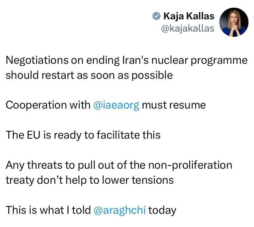 خانه/بینالملل تاکید اتحادیه اروپا بر ازسرگیری مذاکرات و بازرسیهاخواندن1 دقیقه -سه شنبه 1404/04/10 - 23:20کد خبر20668اشتراکگذاری مذاکرات برای پایان دادن به برنامه هستهای ایران باید هر چه سریعتر از سر گرفته شود. توییت کاجا کلاس مسئول سیاست خارجی اتحادیه اروپا پس از گفتوگوی تلفنی با عباس عراقچی وزیر امورخارجه ایران:مذاکرات برای پایان دادن به برنامه هستهای ایران باید هر چه سریعتر از سر گرفته شود.همکاری ایران با آژانس باید از سر گرفته شود. اتحادیه اروپا آماده است تا این امر را تسهیل کند.هرگونه تهدید به خروج از پیمان منع گسترش سلاحهای هستهای به کاهش تنشها کمکی نمیکند.این چیزهایی بود که من امروز به عراقچی گفتم. کمتر از یک دقیقه زمان بگذارید، ثبتنام کنید و نظرتان را زیر همین پست به اشتراک بگذارید.پیامهای توهینآمیز و یا حاوی دعوت به خشونت حذف خواهند شد.ثبت نامدر ادامه بخوانید خبرنگاری با اشاره به حضور استیو ویتکاف و جرد کوشنر و همچنین برد کوپر، رئیس ستاد فرماندهی مرکزی آمریکا در مذاکرات با جمهوری اسلامی در عمان، از دونالد ترامپ پرسید...خواندن 1 دقیقه ترامپ: ما مذاکرات بسیار خوبی درباره ایران داشتیم و به نظر میرسد که ایران به شدت تمایل به دستیابی به توافق دارد.خواندن 1 دقیقه وزارت خارجۀ ایالات متحده بازداشت مصطفی تاجزاده در ایام مرخصی از زندان و انتقال او به اوین را نمایانگر «بیاعتنایی آشکار جمهوری اسلامی به اصول و شرافت انسانی و عدالت» خواند.خواندن 1 دقیقه اطلاعیه و هشدار آمریکا به فارسیخواندن 0 ترامپ درباره اینکه چگونه حماس را به پذیرش توافق واداشت: من کمی محکم صحبت کردم و همین کافی بود. این همان چیزی است که در چنین دنیای سختی جواب میدهد: باید محکم حرف بزنی.خواندن 1 دقیقهباید خواندخاطرات اکبر هاشمی - ۱ اسفند ۱۳۷۸ - ملاقات عبدالله جاسبی و نگرانی از نتایج انتخاباتفیلم/ سردار مرتضی طلایی کجاست؟خاطرات اکبر هاشمی - ۱۹ شهريور ۱۳۷۸ - مذاکرات دو نفره سیاسی با واعظ طبسی تا هنگام بدرقه به سوی تهران هم ادامه داشته که در نهایت هاشمی ظاهرا از اینجا تصمیم به شرکت جدی در انتخابات مجلس ششم گرفتسوابق ادوار اخیر مجلس شورای اسلامی نشان داد که مجلس در راس امور نیست و در اختیارات فرمانده کل قوا و نیروهای مسلح در هیچ سطحی نمیتواند دخالت و یا مصوبه طی کند، چه برسد که نظارت کندآینده ایران با نامزدهای اعلام شده انتخابات ریاست جمهوری چه میشود؟ / گفتگو با دکتر تقی آزاد ارمکیمیشه با شما احساس خستگی کرد؟یک دامپزشک بسیجی بجای جراح گوش و حلق و بینی سرپرست شبکه بهداشت ایذه شد!خاطرات اکبر هاشمی - ۱۴ شهريور ۱۳۷۸ - دیدار مدیران ارشد دستگاه قضایی با هاشمی رفسنجانی و گله آنان از بی توجهی هاشمی شاهرودی رییس جدید قوه قضاییه ادامه داردخاطرات اکبر هاشمی - ۱۶ شهريور ۱۳۷۸ - در ادامه تلاش های مرحوم واعظ طبسی که در دیدارهای مکرر برای تشویق هاشمی به شرکت در انتخابات اقدام میکرد این بار هم او با هاشمی ملاقات کردخاطرات اکبر هاشمی - ۱۸ شهريور ۱۳۷۸ - ادامه بازدید ها از متعلقات و ابنیه و آثار آستان قدس