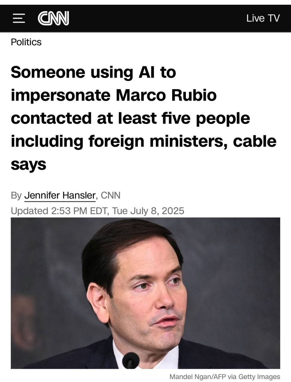 خانه/بینالملل وزیر خارجه آمریکا هک شدخواندن1 دقیقه -چهارشنبه 1404/04/18 - 11:01کد خبر21071اشتراکگذاری بر پایه یک گزارش تاییدشدهی دیپلماتیک، فردی با بهرهگیری از هوش مصنوعی و جعل هویت مارکو روبیو سیانان: بر پایه یک گزارش تاییدشدهی دیپلماتیک، فردی با بهرهگیری از هوش مصنوعی و جعل هویت مارکو روبیو، دستکم با پنج نفر از جمله چند وزیر خارجه تماس گرفته است.وزارت خارجه آمریکا میگوید در حال تحقیق درباره فردی است که با استفاده از هوش مصنوعی، خود را بهجای مارکو روبیو، وزیر خارجه این کشور جا زده و با سه وزیر خارجه تماس گرفته است.در این گزارش آمده است که این فرد با دستکم پنج نفر از جمله سه وزیر خارجه، یک فرماندار ایالتی و یک عضو کنگره آمریکا تماس برقرار کرده است. کمتر از یک دقیقه زمان بگذارید، ثبتنام کنید و نظرتان را زیر همین پست به اشتراک بگذارید.پیامهای توهینآمیز و یا حاوی دعوت به خشونت حذف خواهند شد.ثبت نامدر ادامه بخوانید خبرنگاری با اشاره به حضور استیو ویتکاف و جرد کوشنر و همچنین برد کوپر، رئیس ستاد فرماندهی مرکزی آمریکا در مذاکرات با جمهوری اسلامی در عمان، از دونالد ترامپ پرسید...خواندن 1 دقیقه ترامپ: ما مذاکرات بسیار خوبی درباره ایران داشتیم و به نظر میرسد که ایران به شدت تمایل به دستیابی به توافق دارد.خواندن 1 دقیقه وزارت خارجۀ ایالات متحده بازداشت مصطفی تاجزاده در ایام مرخصی از زندان و انتقال او به اوین را نمایانگر «بیاعتنایی آشکار جمهوری اسلامی به اصول و شرافت انسانی و عدالت» خواند.خواندن 1 دقیقه اطلاعیه و هشدار آمریکا به فارسیخواندن 0 ترامپ درباره اینکه چگونه حماس را به پذیرش توافق واداشت: من کمی محکم صحبت کردم و همین کافی بود. این همان چیزی است که در چنین دنیای سختی جواب میدهد: باید محکم حرف بزنی.خواندن 1 دقیقهباید خواندخاطرات اکبر هاشمی - ۱ اسفند ۱۳۷۸ - ملاقات عبدالله جاسبی و نگرانی از نتایج انتخاباتفیلم/ سردار مرتضی طلایی کجاست؟خاطرات اکبر هاشمی - ۱۹ شهريور ۱۳۷۸ - مذاکرات دو نفره سیاسی با واعظ طبسی تا هنگام بدرقه به سوی تهران هم ادامه داشته که در نهایت هاشمی ظاهرا از اینجا تصمیم به شرکت جدی در انتخابات مجلس ششم گرفتسوابق ادوار اخیر مجلس شورای اسلامی نشان داد که مجلس در راس امور نیست و در اختیارات فرمانده کل قوا و نیروهای مسلح در هیچ سطحی نمیتواند دخالت و یا مصوبه طی کند، چه برسد که نظارت کندآینده ایران با نامزدهای اعلام شده انتخابات ریاست جمهوری چه میشود؟ / گفتگو با دکتر تقی آزاد ارمکیمیشه با شما احساس خستگی کرد؟یک دامپزشک بسیجی بجای جراح گوش و حلق و بینی سرپرست شبکه بهداشت ایذه شد!خاطرات اکبر هاشمی - ۱۴ شهريور ۱۳۷۸ - دیدار مدیران ارشد دستگاه قضایی با هاشمی رفسنجانی و گله آنان از بی توجهی هاشمی شاهرودی رییس جدید قوه قضاییه ادامه داردخاطرات اکبر هاشمی - ۱۶ شهريور ۱۳۷۸ - در ادامه تلاش های مرحوم واعظ طبسی که در دیدارهای مکرر برای تشویق هاشمی به شرکت در انتخابات اقدام میکرد این بار هم او با هاشمی ملاقات کردخاطرات اکبر هاشمی - ۱۸ شهريور ۱۳۷۸ - ادامه بازدید ها از متعلقات و ابنیه و آثار آستان قدس